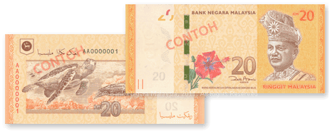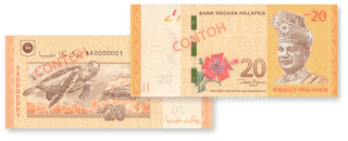KUALA LUMPUR: Perdana Menteri Datuk Seri Najib Tun Razak melancarkan reka bentuk wang kertas baru termasuk not RM20 baru yang akan mula diedarkan tahun depan. Wang kertas RM20 kembali diperkenalkan dalam siri matawang baru Malaysia. Wang berwarna kuning keemasan itu memaparkan dua spesis penyu yang hanya dijumpai di perairan Malaysia iaitu penyu karah dan belimbing. Semua wang kertas baru akan diedarkan pertengahan tahun depan. Not RM50 sudah pun diedarkan dan syiling yang dilancarkan Julai lalu akan diedarkan Januari 2012.